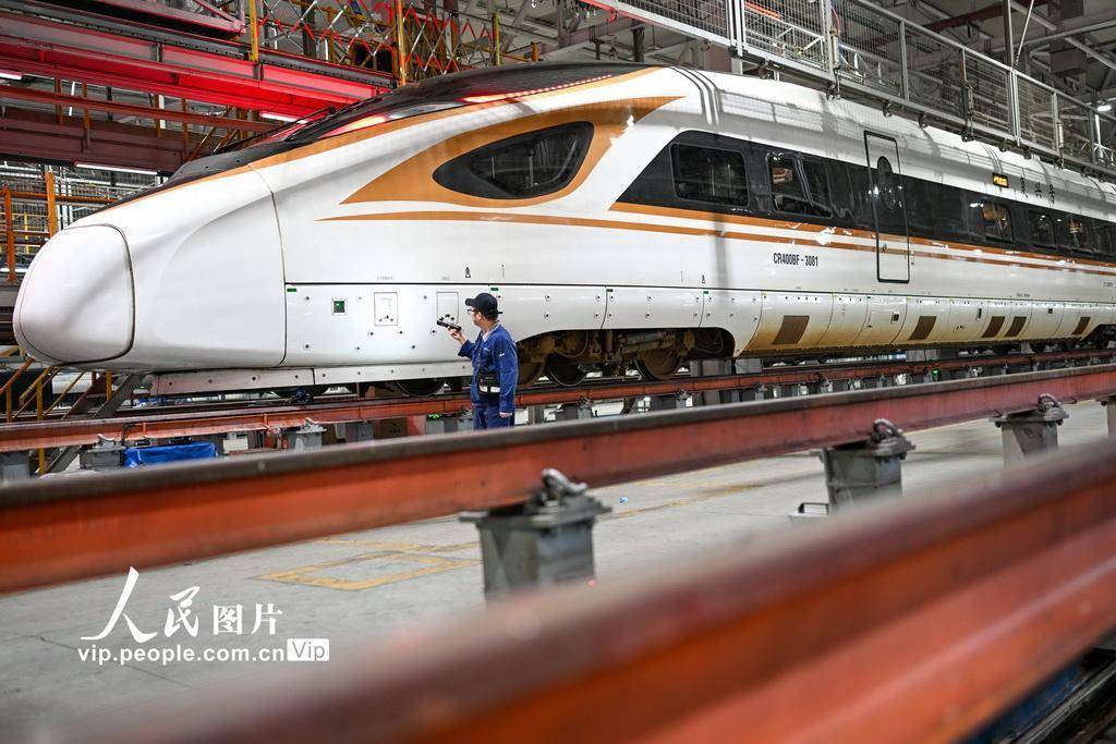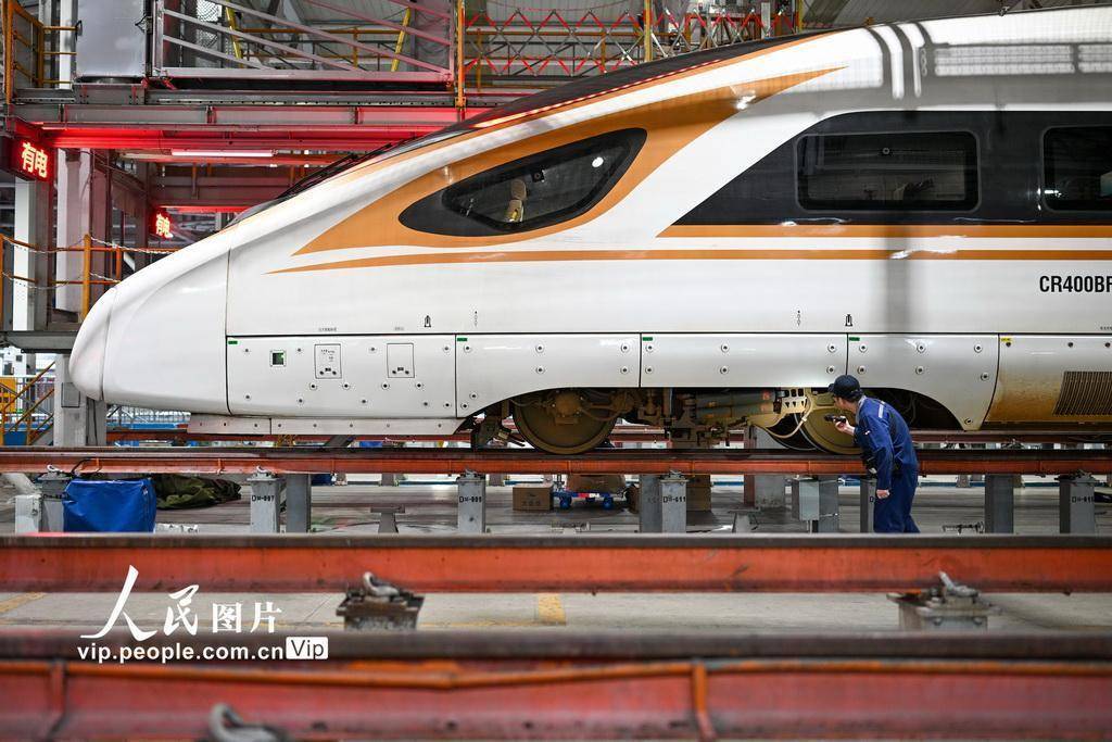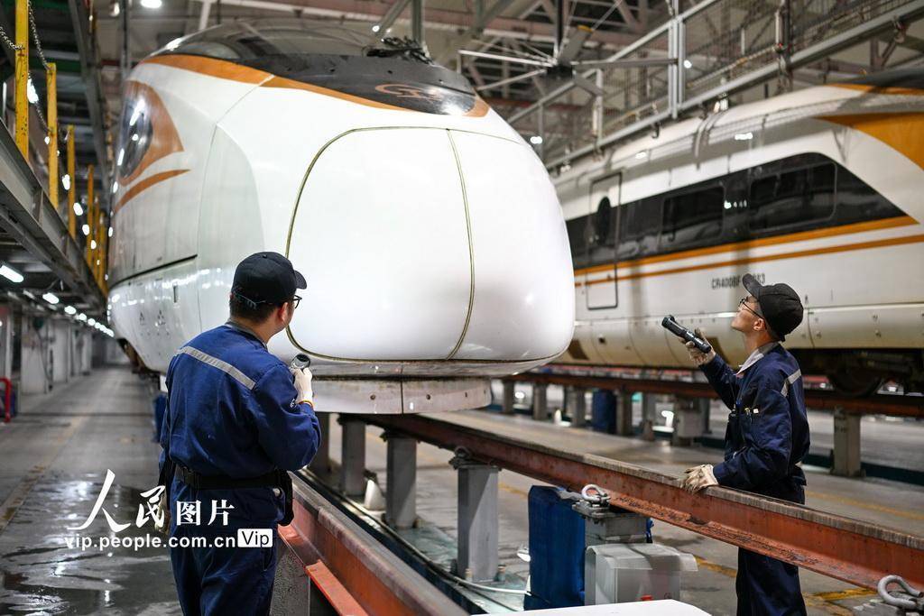 2025年11月15日凌晨,在南京动车段南京南动车运用所检修库,地勤机械师对车体外表进行检查。