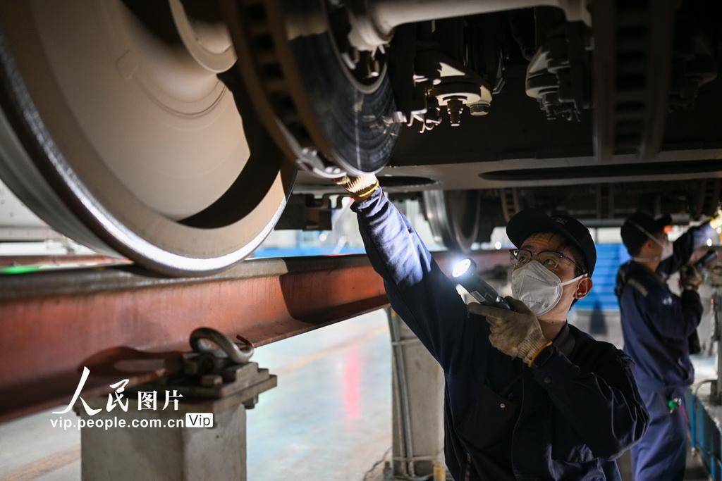 2025年11月15日凌晨,在南京动车段南京南动车运用所检修库,地勤机械师在检查动车轮对。