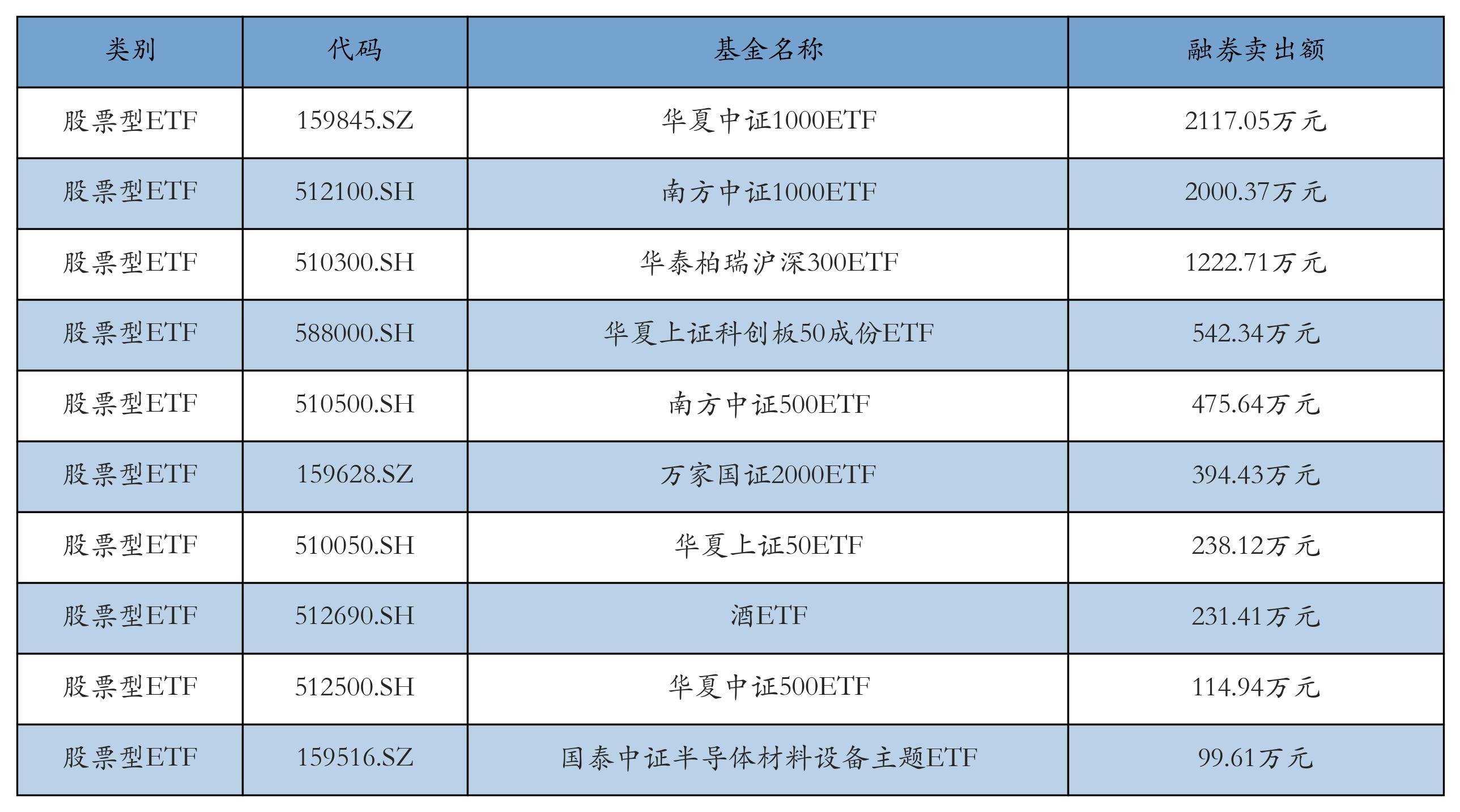 昨日股票型ETF融资卖出额最高的3只ETF及其卖出金额分别为:华夏中证1000ETF(2117.05万元)、南方中证1000ETF(2000.37万元)、华泰柏瑞沪深300ETF(1222.71万元)。融券卖出额前10详情见下表:
