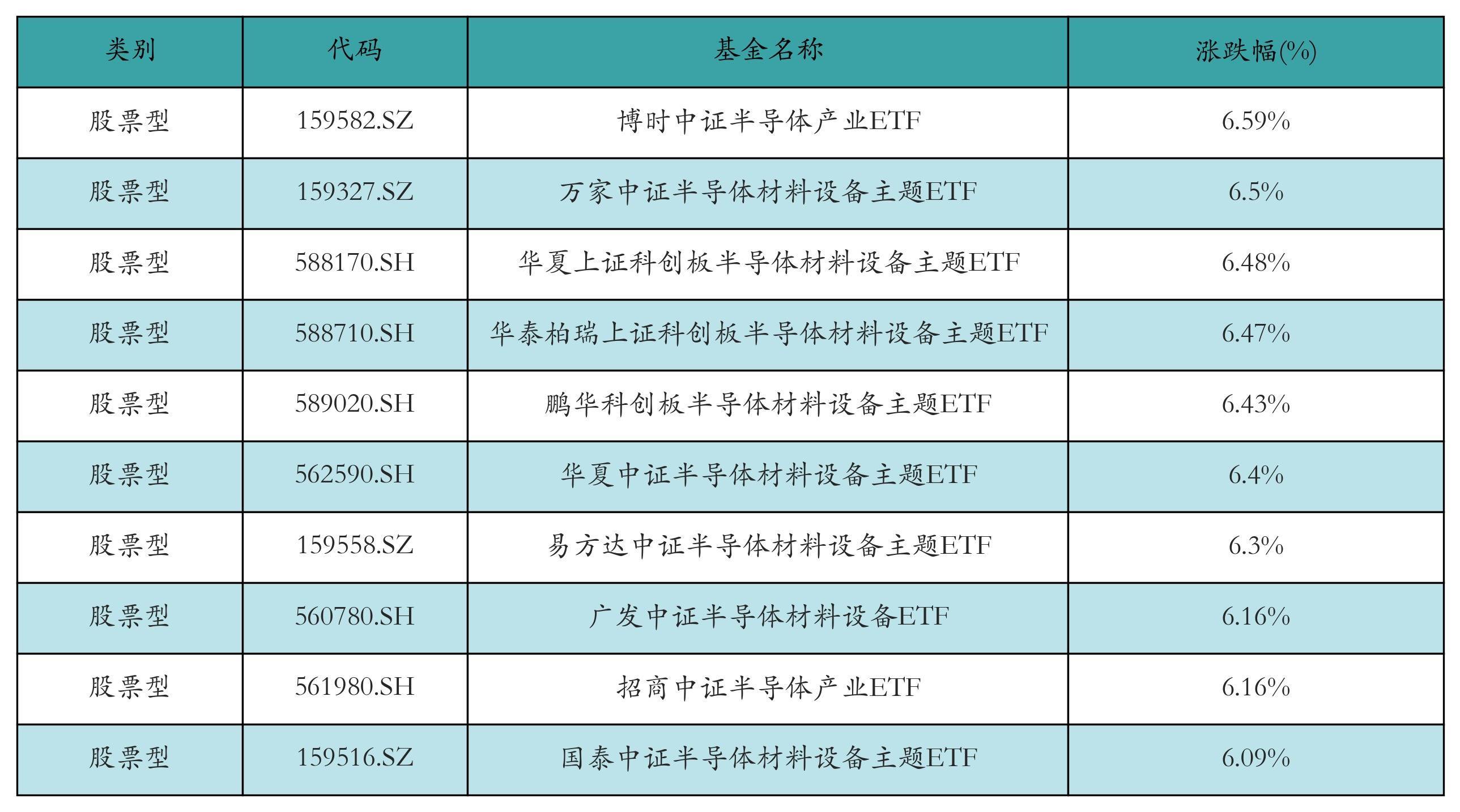 昨日股票型ETF涨幅最高的3只ETF及其收益率分别为:博时中证半导体产业ETF(6.59%)、万家中证半导体材料设备主题ETF(6.5%)、华夏上证科创板半导体材料设备主题ETF(6.48%)。涨幅前10详情见下表:
