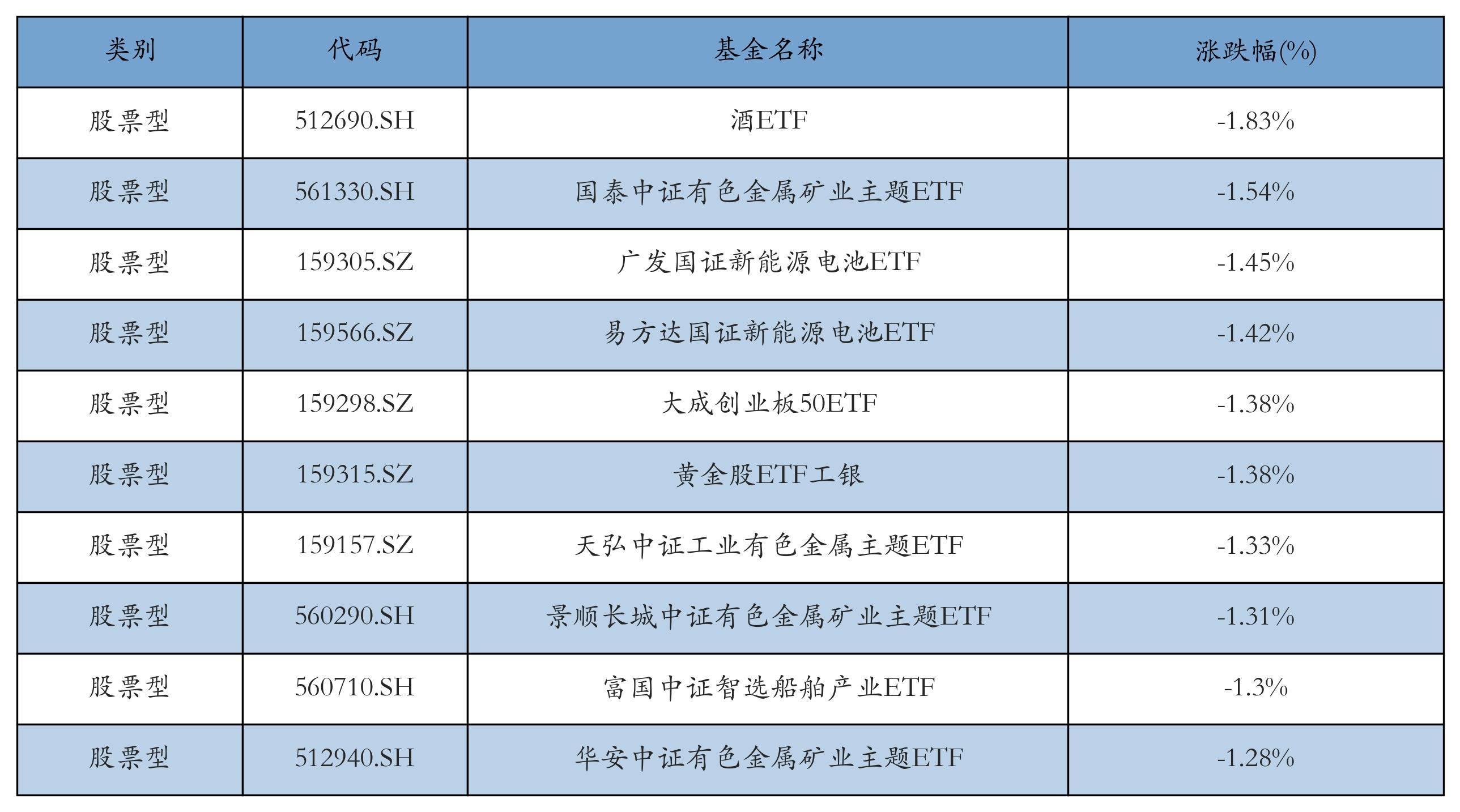 昨日股票型ETF跌幅最大的3只ETF及其收益率分别为:酒ETF(-1.83%)、国泰中证有色金属矿业主题ETF(-1.54%)、广发国证新能源电池ETF(-1.45%)。跌幅前10详情见下表: