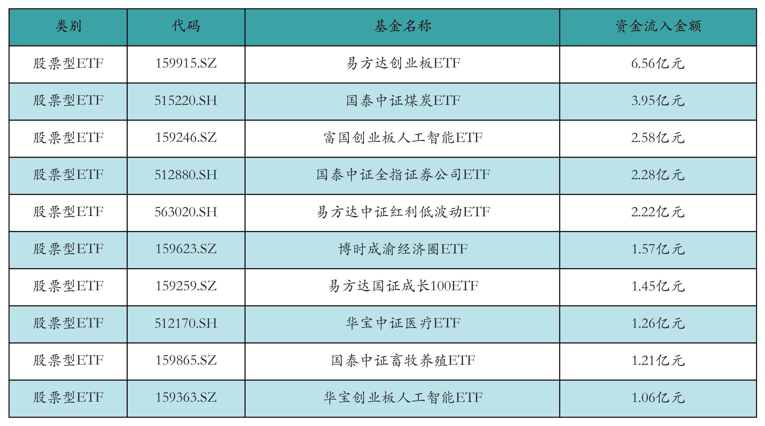 昨日股票型ETF资金流入最多的3只ETF及其流入金额分别为:易方达创业板ETF(流入6.56亿元)、国泰中证煤炭ETF(流入3.95亿元)、富国创业板人工智能ETF(流入2.58亿元)。资金流入前10详情见下表: