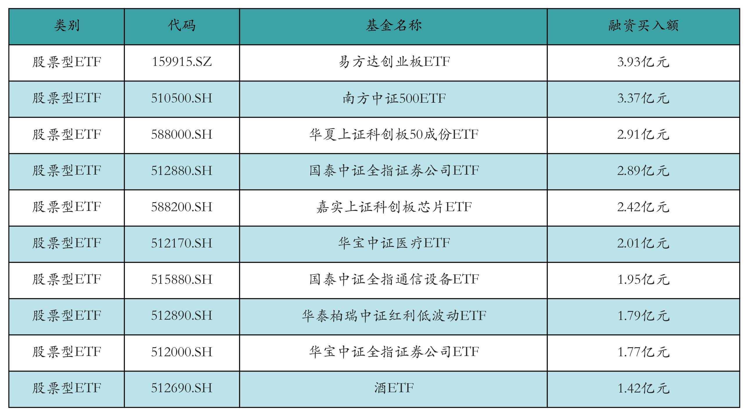昨日股票型ETF融资买入额最高的3只ETF及其买入金额分别为:易方达创业板ETF(3.93亿元)、南方中证500ETF(3.37亿元)、华夏上证科创板50成份ETF(2.91亿元)。融资买入额前10详情见下表: