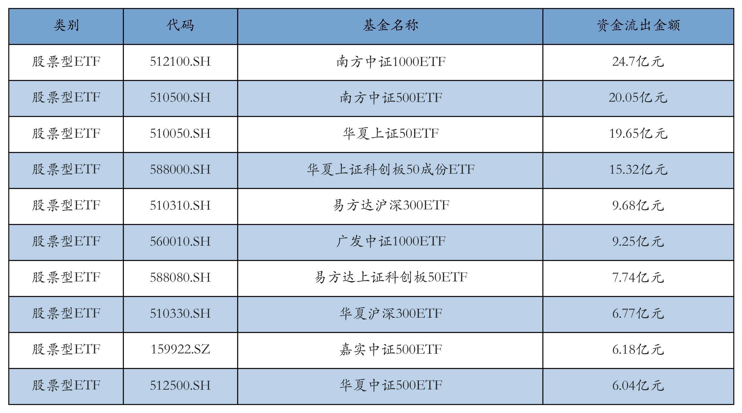 昨日股票型ETF资金流出最多的3只ETF及其流出金额分别为:南方中证1000ETF(流出24.7亿元)、南方中证500ETF(流出20.05亿元)、华夏上证50ETF(流出19.65亿元)。资金流出前10详情见下表: