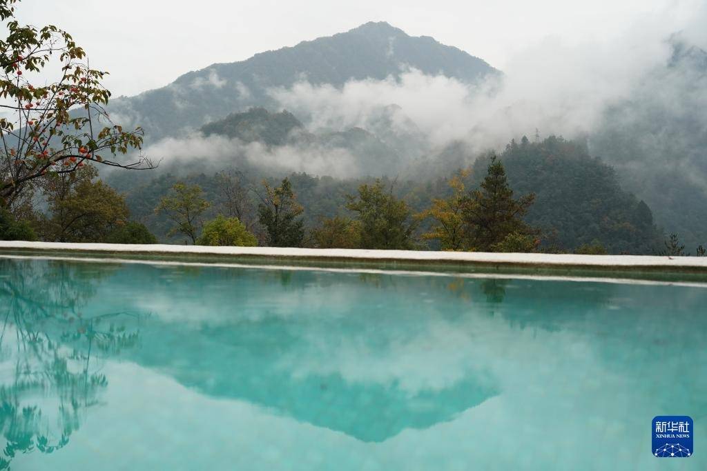 镇坪县牛头店镇国庆村一家山居酒店的泳池与周边景色(10月29日摄)。